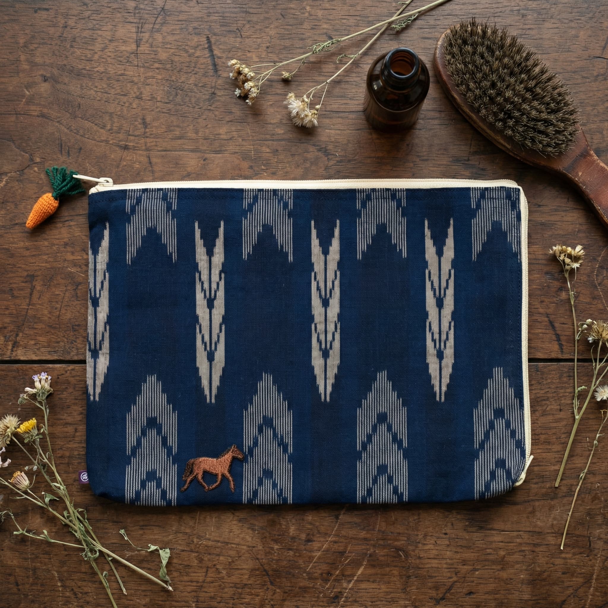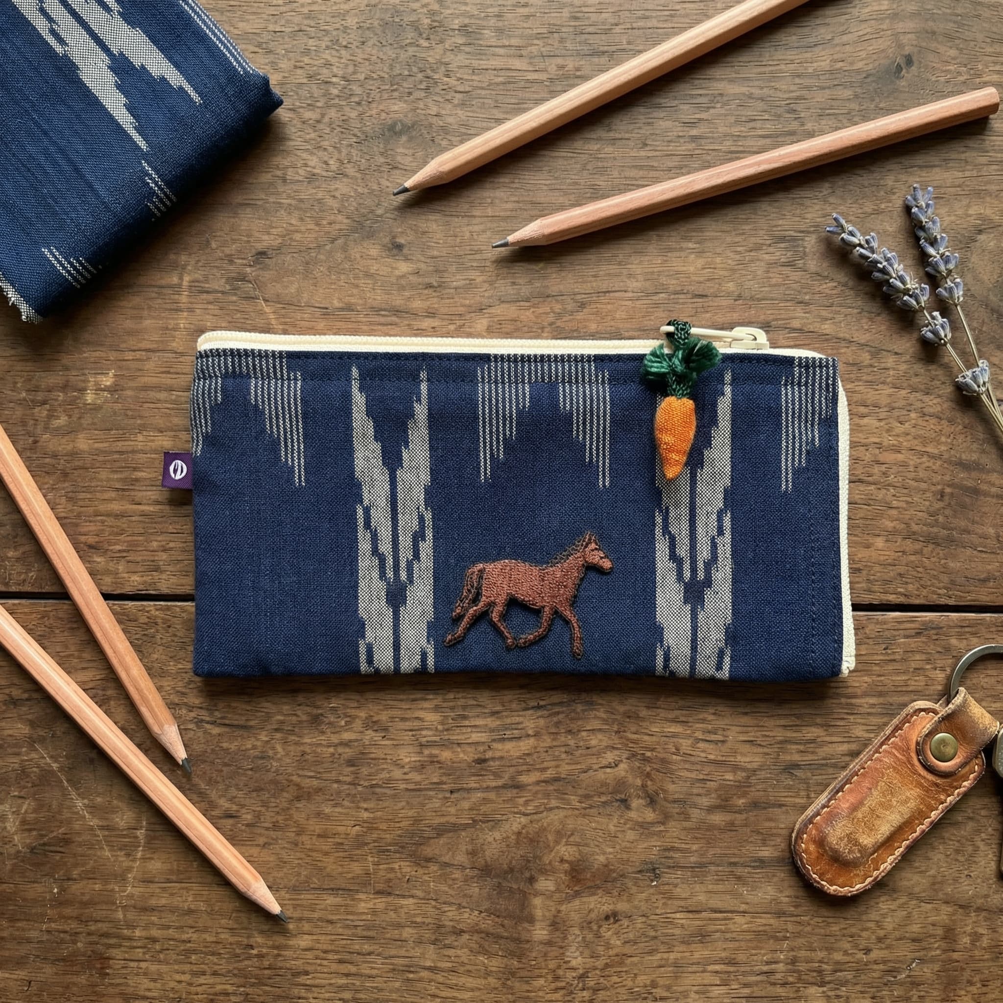 久留米絣の様々な柄から選んだ布に、にんじんのストラップ。「馬のおやつ」を持ち歩くように、日常の小物を入れて。